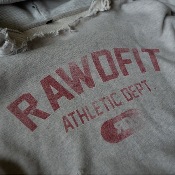 The RAWDFIT Athletic Dept. Training Hoodie is crafted in a heavyweight french terry cotton with a naturally aged, vintage finish. The raw-cut neckline is intentional — made to feel worn-in from day one, like the hoodie you’ve trained in for years.